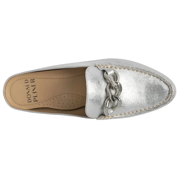 The BLESS slip-on in soft metallic brushed leather combines a mule silhouette with loafer details to create a uniquely polished casual style. With a memory foam padded insole and flexible rubber outsole, the design is ultra comfortable for extended wear. A gleaming statement chain adorns the vamp, giving this shoe a luxe finish.