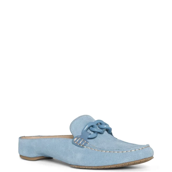 The BLESS slip-on in soft calf suede combines a mule silhouette with loafer details to create a uniquely polished casual style. With a memory foam padded insole and flexible rubber outsole, the design is ultra comfortable for extended wear. A gleaming statement chain adorns the vamp, giving this shoe a luxe finish.