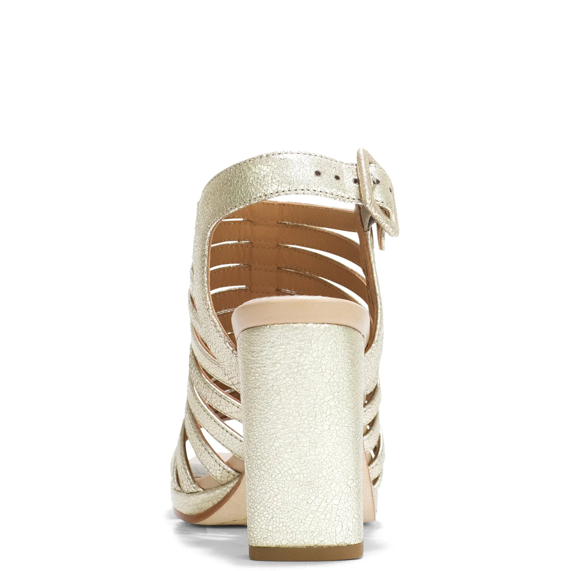 The SEVANNA high-heeled sandal in vintage metallic leather is sure to stun for any occasion. This beautiful shoe features an open-toe design with a caged, slingback upper and a boldly squared toe. Resting on a mini platform and a tall heel, this style fastens with a polished buckle strap and has memory foam cushioning for all-day comfort. It’s finished with a buffed leather outsole.
